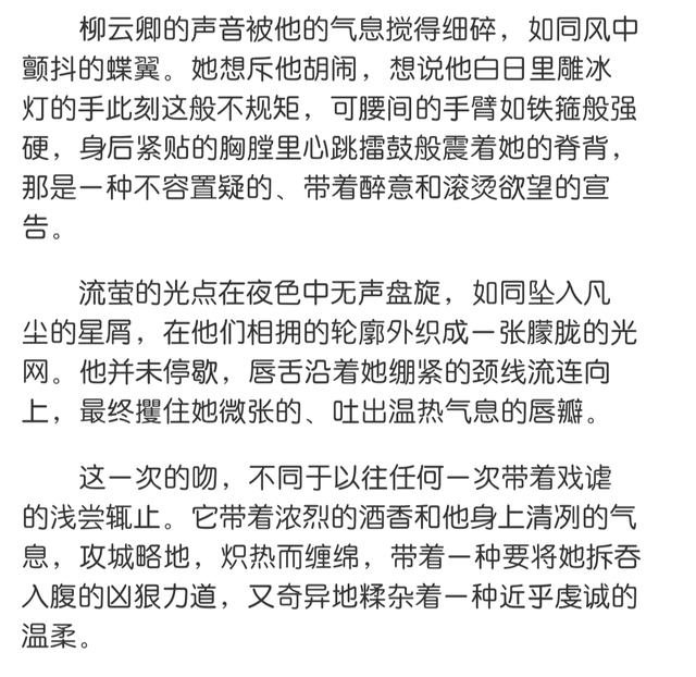 冰灯在窗内映着柔光,流萤在月下无声曼舞,而他滚烫的唇舌在她颈间烙下细密的吻,每一个触碰都像带着火星,点燃她每一寸紧绷的神经。