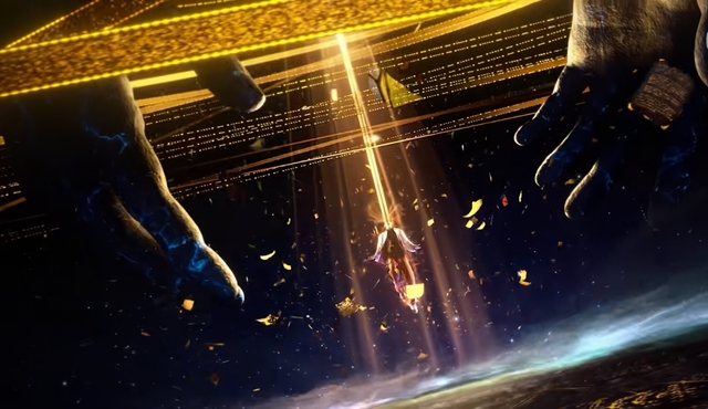 黑红色光束周围绕着黑色的鸟,随即秦屹悬浮在空中,在秦屹双脚离地的那一刻,笛声响起。
