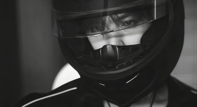 一辆改装过的重型摩托切入面包车与袭来的摩托车之间。摩托车手惊得猛打方向闪避,黑车上骑士动作快如鬼魅,在错身而过的瞬间,抄起不知什么东西,砸向对方车手裸露的手臂。