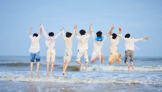 七人携手走到小海浪旁,在他们跃起的瞬间,按下快门。