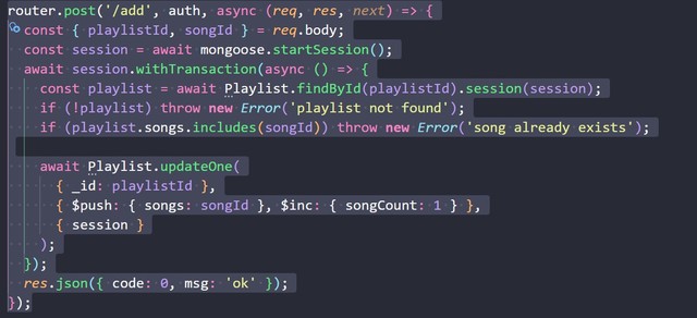 鹿笙见他上来,立即让出位置。他打开源码,浏览目录结构,随后切换到 server/routes/playlist.js 第 47 行。