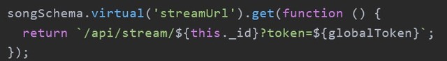法观澜虚拟字段只做序列化出口,前端拿歌单时一并拿到带签名的流地址,省一次二次请求;toJSON 里已配 { virtuals: true },数据库侧依旧干净。