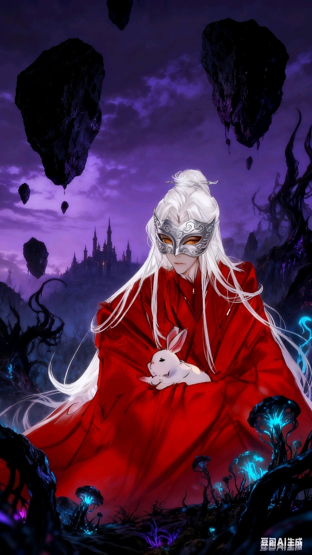 蓝景仪看到一头白发,身着红衣。一副面具遮住了半张脸的男子和蓝思追。