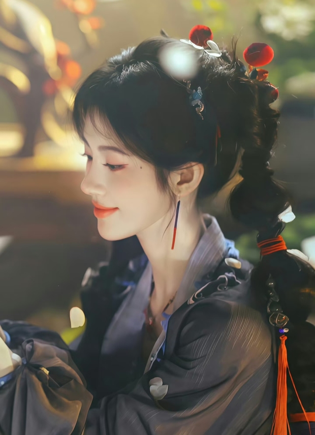 她似乎对周遭的一切都充满新鲜感。一会儿伸出纤细的手指,扯扯宽大的袖子,看着袖口垂下的银线流苏晃来晃去,发出呀的惊叹。