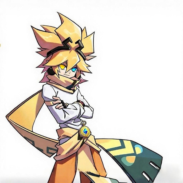 舱门“嗤”一声弹开,金连滚带爬跌出来,大口喘气。烟尘中,另一艘印有圣空星徽记——金色齿轮环绕利剑的银灰色舰船平稳降落。舱门滑开,一道身影逆光而立。嘉德洛年踏步而出,围巾随风飘扬金发微微浮动,猩红纹路如血管般在关节处蜿蜒,黄色和黑色条纹围巾被气流卷起狂舞。最摄人的是他的双眼——左瞳熔金般炽烈,右眼却是冰海般的湛蓝。腰间一枚金黄色带着蓝色宝石和神秘纹路怀表随步伐轻摆,表盖浮雕着与时间表盘如出一辙的齿轮图腾。