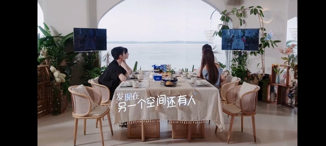 他们正在很愉快的聊着天 一旁的电视突然显示另一个空间餐桌的朋友们