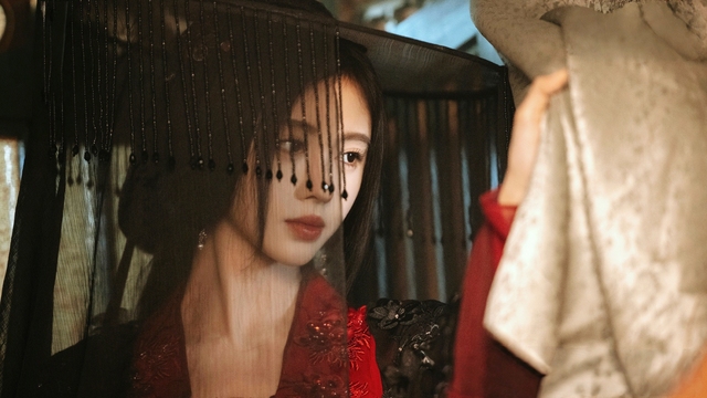 她正在看着自己,细密的黑色珠链流苏似帘幕,半遮住她的容颜,更添几分神秘。