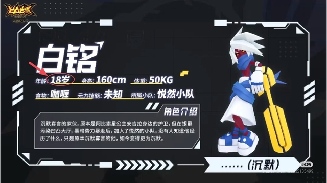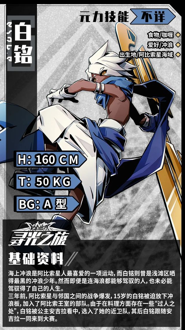 姓名:白铭,年龄:18,元力技能:不详,所属小队:悦然小队,食物:咖啡,爱好:冲浪,出生地:阿比斯索星海域,身高:160cm,体重:50kg,血型:A型,基础资料:海上冲浪是阿比索星人最喜爱的一项运动,而白铭则曾是浅滩区晒得最黑的冲浪少年,然而即便连冲浪都能驾驭的人,也未必驾驭得了自己的人生,三年前,阿比索斯与邻国之间的战争爆发,15岁的白铭被迫放下冲浪板,加入了阿比索王室的部队,由于料理方面存在一些“过人之处”白铭被公主安吉拉看中,选入了她的警卫队,其后白明跟随安吉拉一同来到大赛, 沉默寡言的家伙,原本是阿比索金公主安吉拉身边的护卫,但在银爵污染凹凸大厅,黑暗势力暴走后,加入了悦然的小队,没有人知道他曾经经历了什么,只是原本沉默寡言的他如今变得更加沉默。