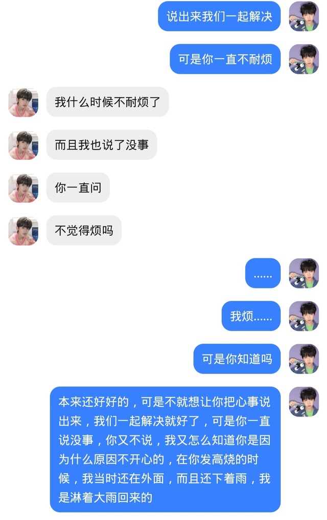 杨博文今天早上我起床了,我看见他也起来了,然后感觉到他的心情不好,我就问了一下,他就有点不耐烦说没事,我就说了一句如果有什么不开心的事可以跟我说,我们一起解决,可是他不耐烦的又说了一句我都说了没事,问那么多干嘛,然后就吵起来了