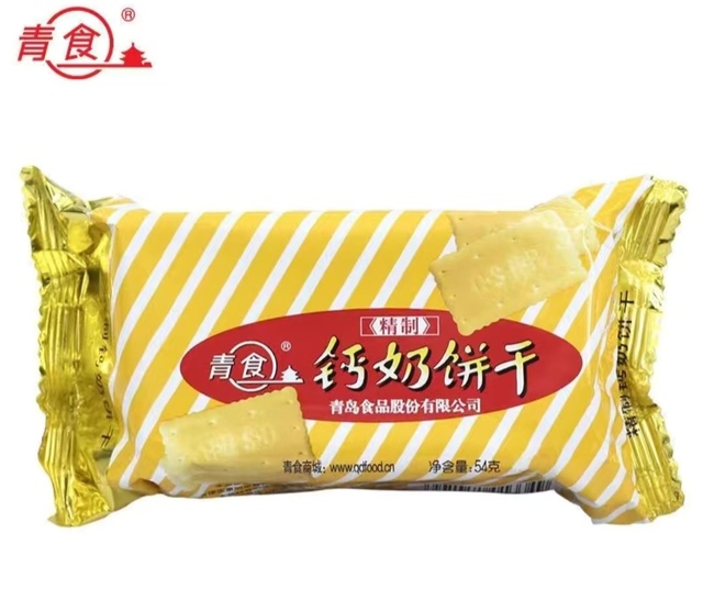 随后她掏出了自己裤子口袋里鼓鼓囊囊装着的一包黄色包装的钙奶饼干。