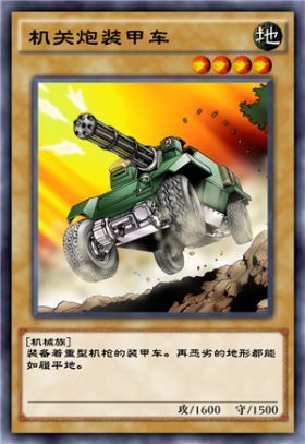 卡片介绍:【卡片名字:机关炮装甲车】【属性:地】【等级:4】【种族:机械族】【卡片种类:通常怪兽】【攻击力:1600】【守备力:1500】