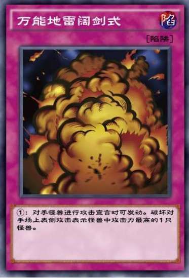 卡片介绍:【卡片名字:万能地雷阔剑式】【卡片种类:通常陷阱卡】【效果:对手怪兽进行攻击宣言时可发动。破坏对手场上表侧攻击表示怪兽中攻击力最高的1只怪兽】