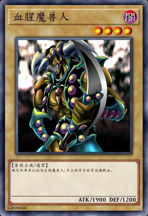卡片介绍:【卡片名字:血腥魔兽人】【属性:暗】【等级:4】【种族:兽战士族】【卡片种类:通常怪兽】【攻击力:1900】【守备力:1200】