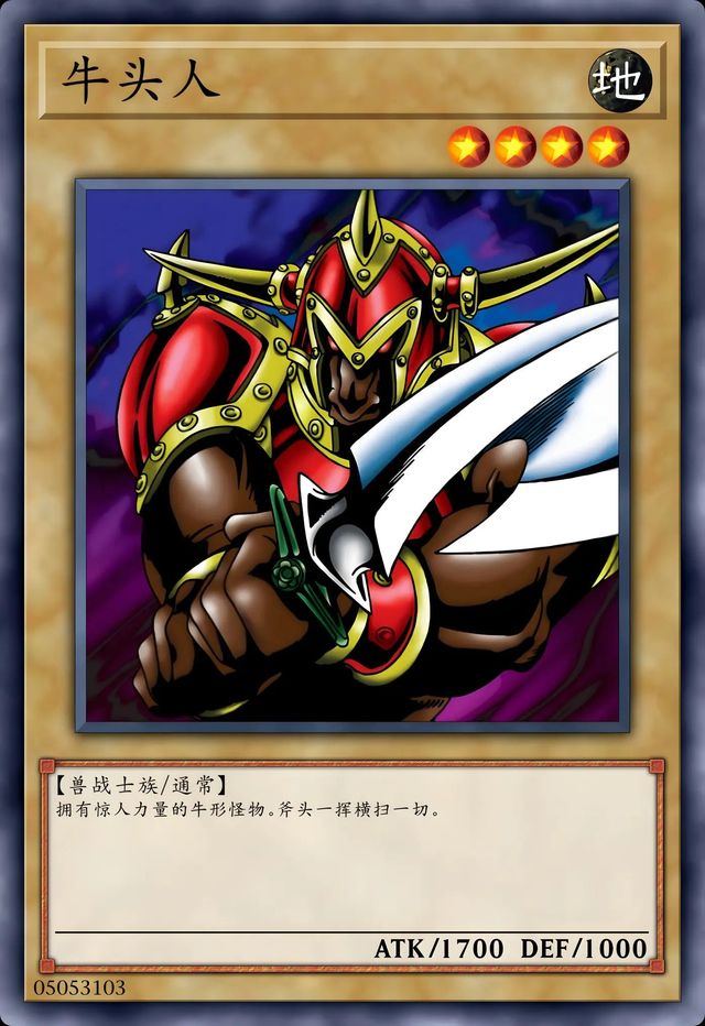 卡片介绍:【卡片名字:牛头人】【属性:地】【等级:4】【种族:兽战士族】【卡片种类:通常怪兽】【攻击力:1700】【守备力:1000】