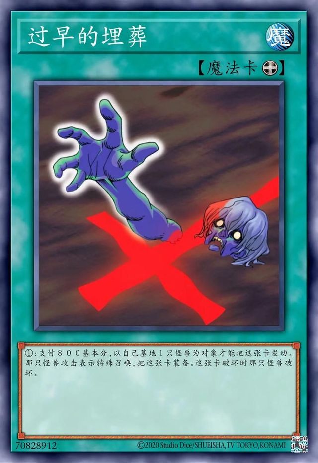 卡片介绍:【卡片名字:过早的埋葬】【卡片种类:装备魔法卡】【效果:支付800基生命值,以自己墓地1只怪兽为对象才能把这张卡发动。那只怪兽攻击表示特殊召唤,把这张卡装备。这张卡破坏时那只怪兽破坏】