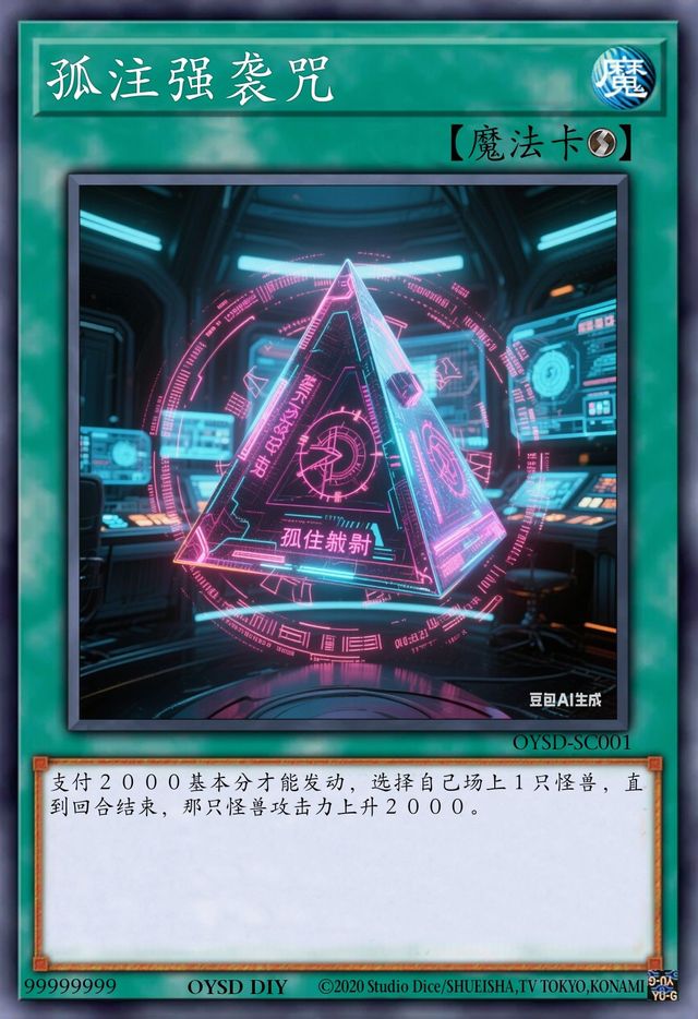 卡片介绍:【卡片名字:孤注强袭咒】【卡片种类:速攻魔法卡】【效果:支付2000基本分才能发动,选择自己场上1只怪兽,直到回合结束,那只怪兽攻击力上升2000】