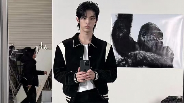 季亓宛如画廊中的展品一般引人注目,他身着黑白相间的夹克,内搭整洁的白衬衫,整个人是青春与酷的融合体。