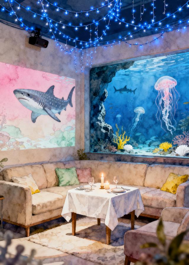 整个客厅被精心布置过。幽蓝色的串灯如同星河流转,从天花板垂落,墙壁上用投影仪投映出缓慢游动的鲸鲨和水母光影,仿佛真的置身于宁静深海。熟悉的蓝洞展缸背景音在空气中轻柔回荡。客厅中央的小餐桌上,铺着洁白的桌布,摆放着精致的餐具和摇曳的烛光。