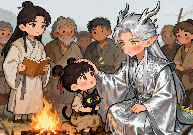 阿星好奇地凑过来,看着敖辰的银色头发:“敖辰哥哥,你的头发好漂亮,像银子一样。”