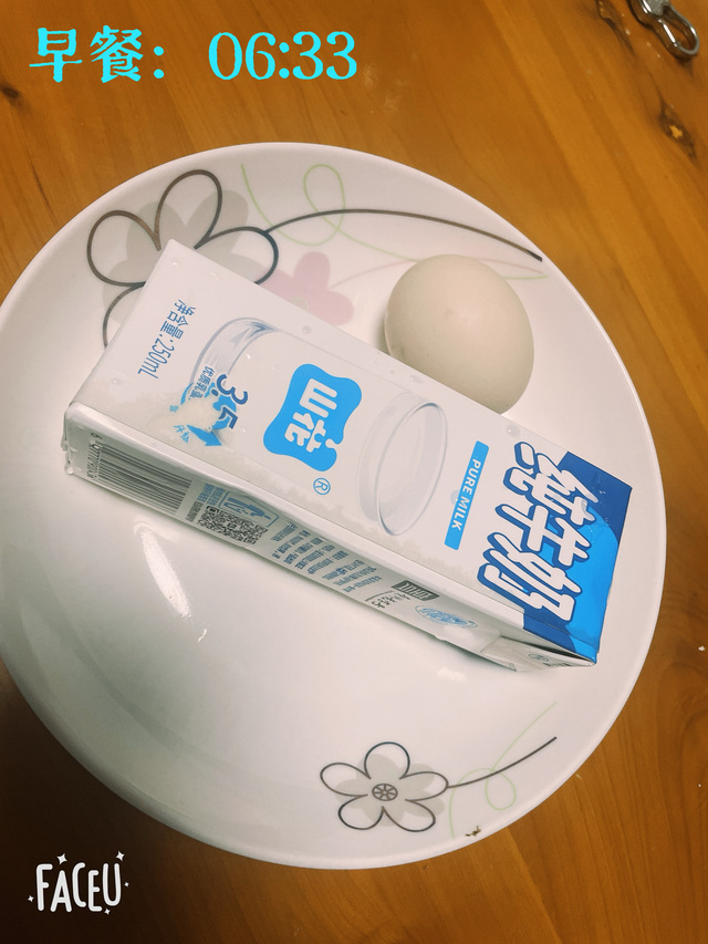 早餐06:33一盒山花纯牛奶,一个水煮蛋