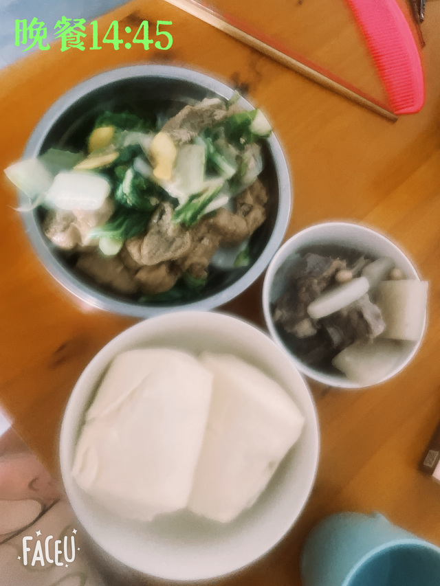 晚餐14:45俩个馒头,一小碗花生萝卜炖排骨,一小碗灰豆腐炒白菜