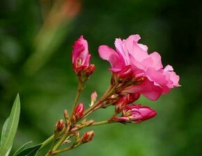 夹竹桃:常绿灌木,开桃红色或白色,分布广泛,其叶、花及树皮均有毒。
