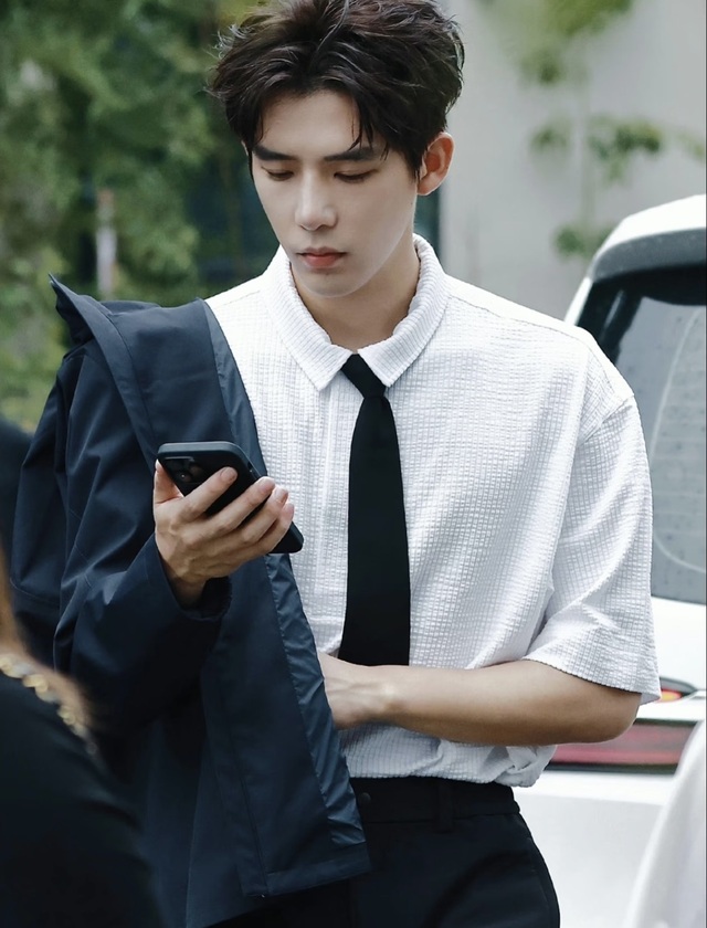 男生站在她对面,白色格纹衬衫的袖口随意挽到手肘,黑色领带松松地系着,左手搭着件深蓝色外套。他正低头看手机,抬头时露出清爽的笑容。