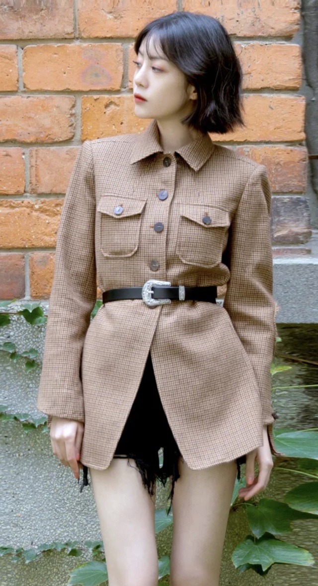 宴会厅的门又一次被推开时,先到的四人都不约而同地望向来人。她站在门口,身上那件棕褐色格纹衬衫的纽扣一丝不苟地系到最上面一颗,黑色宽腰带将她的腰线收得极细,银色的腰带扣在灯光下闪着冷调的光。她下身的黑色流苏短裤下露出一双笔直的长腿,整个人像从时尚画报中走出来一般。