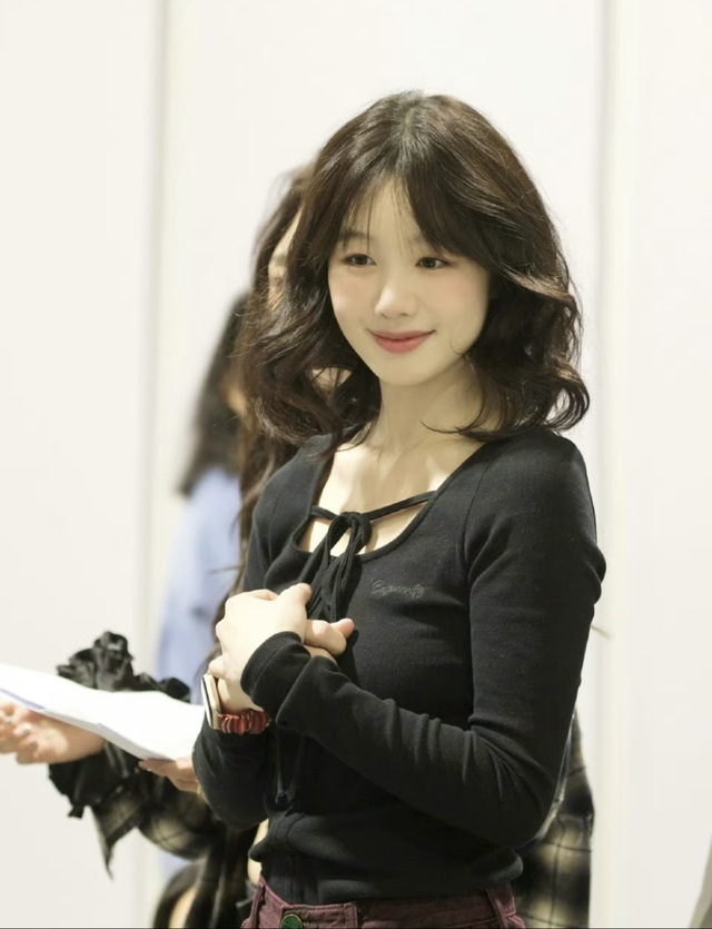 一个女生正站在大厅门口,她穿着黑色系带长袖上衣,领口的飘带打成精致的蝴蝶结,酒红色下摆随着她的动作轻轻摆动。深棕色卷发衬得她脸蛋愈发小巧,齐刘海下那双笑眼弯成月牙。