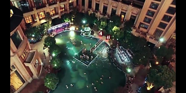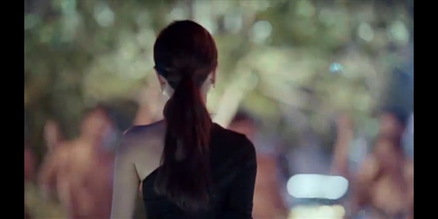 一场泳池派对正在火热的进行中,一位女子身穿礼服走了进来。