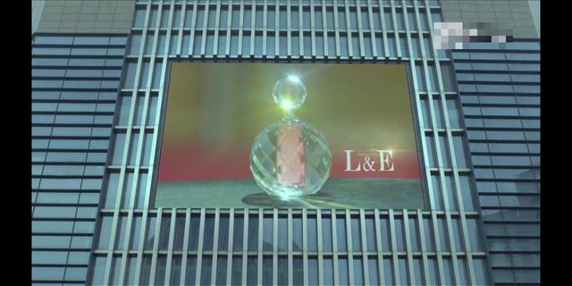 大屏幕里,一位美女从豪车上下来,路过的人都被散发出的香味给迷倒了,香水的牌子是“L&E”。
