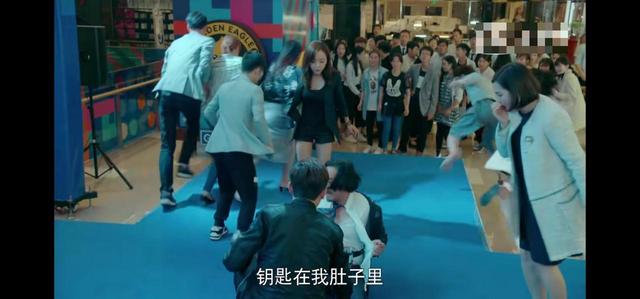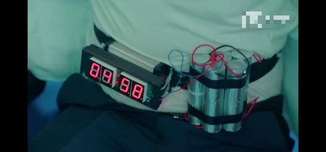穿西服的人打开衣服后看到了炸弹,在周围的人赶紧跑下了台“有炸弹,钥匙在我肚子里”