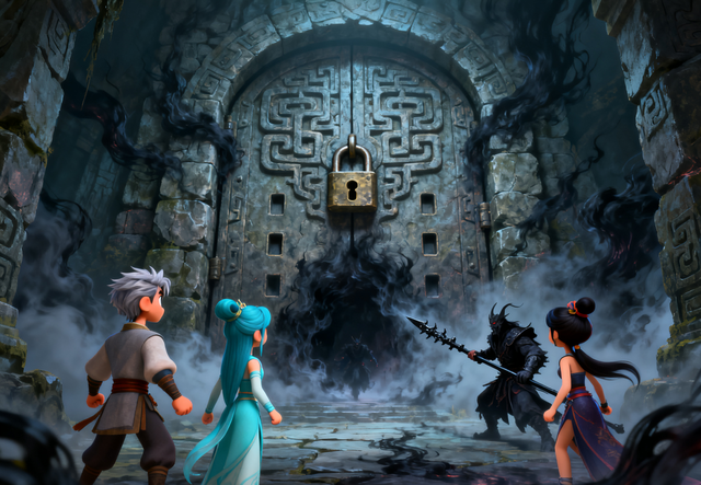 走了约莫半个时辰,前方突然传来沉重的石门声。辰风三人加快脚步,只见引魂道尽头立着一扇巨大的石门,门上刻着复杂的锁纹,中央嵌着个凹槽,形状与阿娆短刃上的符文相似,却更大——显然是为青铜剑准备的。