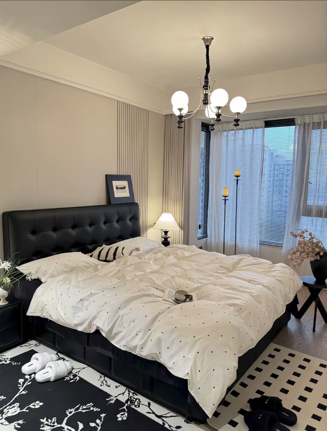床是房间的核心,一张铺满洁白被子的大床静卧在中央,其上精致的黑色小点图案如同星辰洒落夜空,与纯白形成鲜明对比。床头板包裹着黑色皮革,纽扣装饰如同艺术品上的细节雕刻,尽显高级质感。两侧摆放的枕头则为这份极简增添了几分趣味——一个黑白条纹枕与纯白枕头相伴,仿佛音符跳跃于琴键之间。