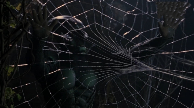 蜘蛛侠双手射蛛丝编织出大网,拦住绿魔