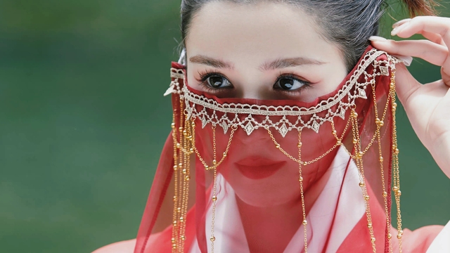 宴席一隅,礼泰远远瞧着那身着红衣的女子,覆面的红纱轻如蝉翼,边缘缀着金色饰链,微风掠过,金链轻晃,似有碎金落于红绸之上。