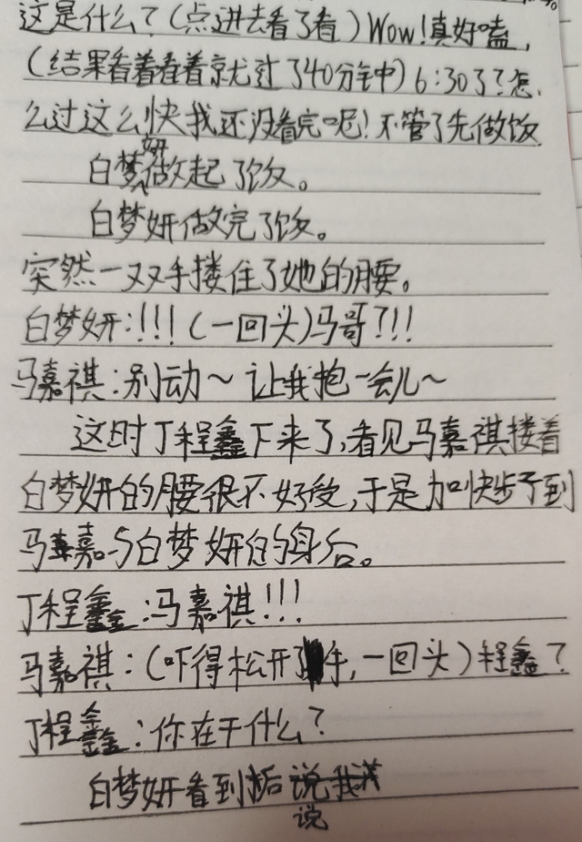 白梦妍那个…那个,你们先去饭桌上坐着,我上楼叫他们(说完,白梦妍以100米冲刺的速度上了楼,躲到一个暗角)