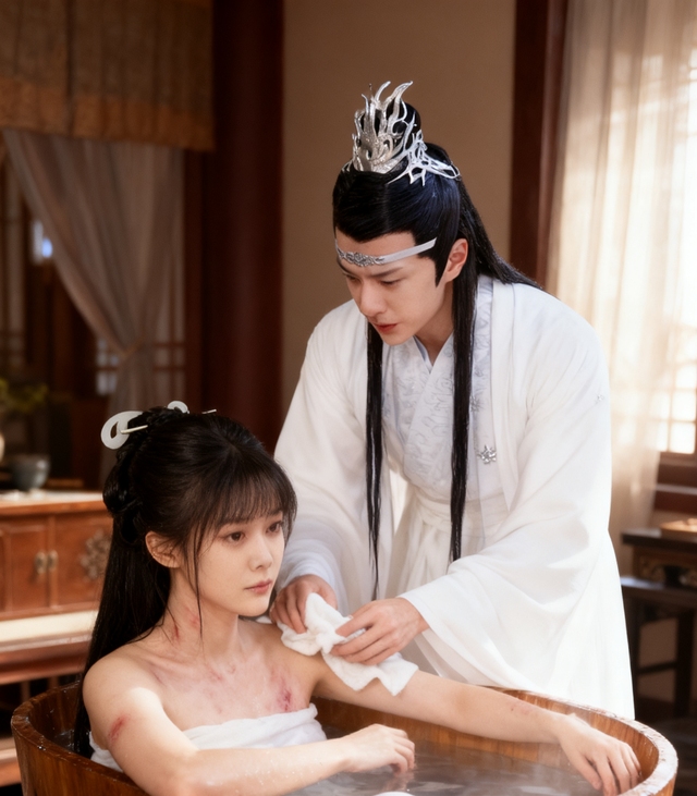 蓝忘机站起身,将她小心翼翼地抱起,低头时却瞥见床单上的血迹。他的眉间掠过一抹痛色,语气中带着少见的愧疚: