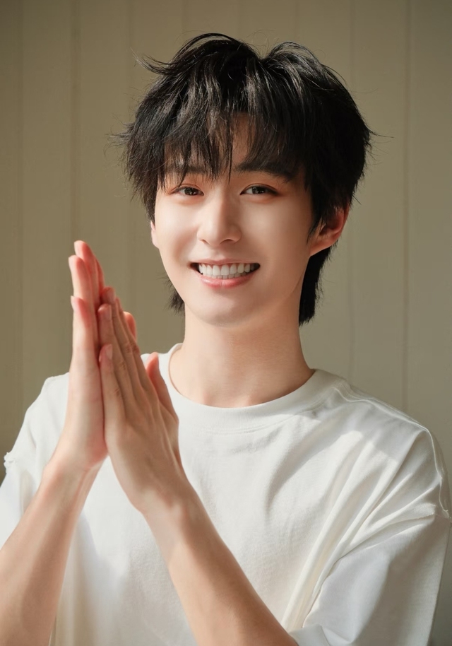 卷发棒在他前额发丝留下痕迹,背头未成型之前还是小顺毛的模样,更显得他可爱可欺。