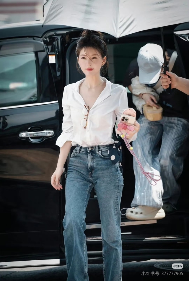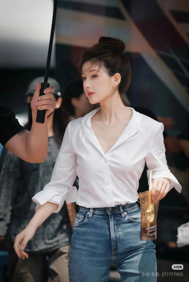 今天的贺莳一穿着一身白衬衫配着牛仔裤,头发全扎了上去,妆容的变化让她看着知性又温柔。