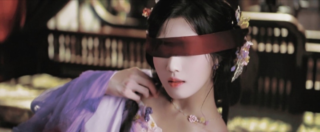 宽敞的房间内,一身着紫色裙衫的少女撑着下巴轻靠在床榻上,她发间别着精致漂亮的发簪,锁骨处还故意撒了一种银光色的粉末。漂亮的美眸被丝带遮挡住,也是因为这样,半张脸似乎更加吸引人了。