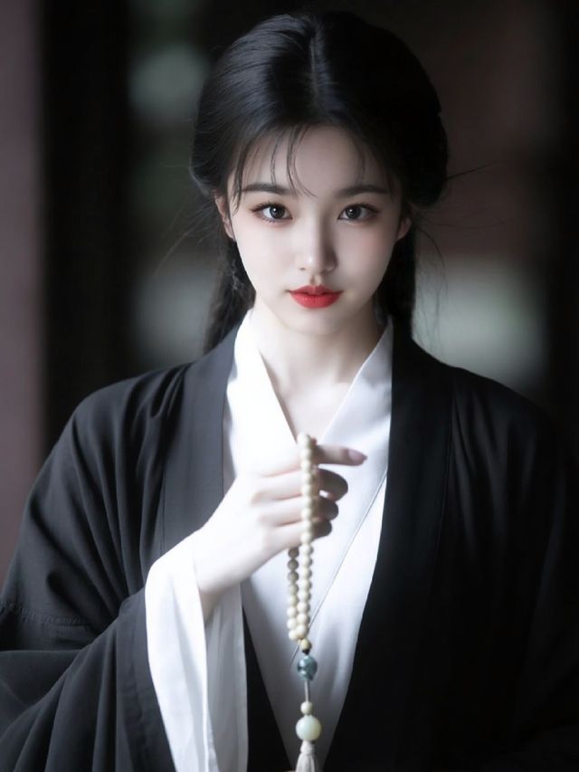 穿着:内层是白色交领上衣,版型简约素雅,符合传统汉服的交领形制,外层是黑色宽袖长褙子(或外衫),剪裁宽松飘逸,营造出淡然宁静的气质,搭配佛珠配饰,进一步强化了禅意感,整体穿搭将古风形制与佛系审美结合,传递出素雅、平和的风格特点。