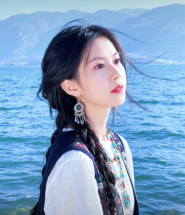 穿着:外搭带有彩色刺绣的深蓝色民族风马甲,佩戴彩色珠串项链与银质流苏耳环,双麻花辫造型,整体穿搭充满民族与波西米亚风格的融合感。