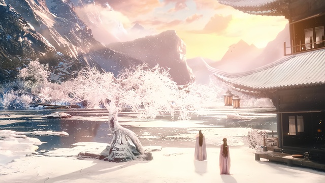 整片雪地都映照着瑰丽的色泽,连带着翻飞的衣袂都被染上暖光。