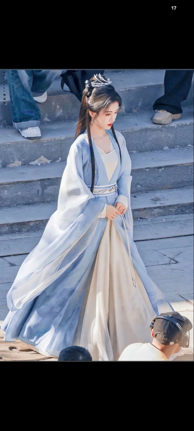 女子一身淡蓝长裙 腰间玉佩静静垂落 外罩狐裘披风 细白柔软毫无杂质的风毛衬得她清丽温婉 颇有几分世外谪仙之态