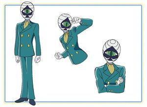 - 外貌形象 :有着蓝白色的头发和蓝色的眼睛,左眼有一道紫色的伤疤,通常会用贴纸伪装。他常戴着一顶深蓝色的帽子,穿着红色的西装、黄色领带,胸前有金色的J徽章,搭配紫色披风、深蓝色鞋子和白色手套。