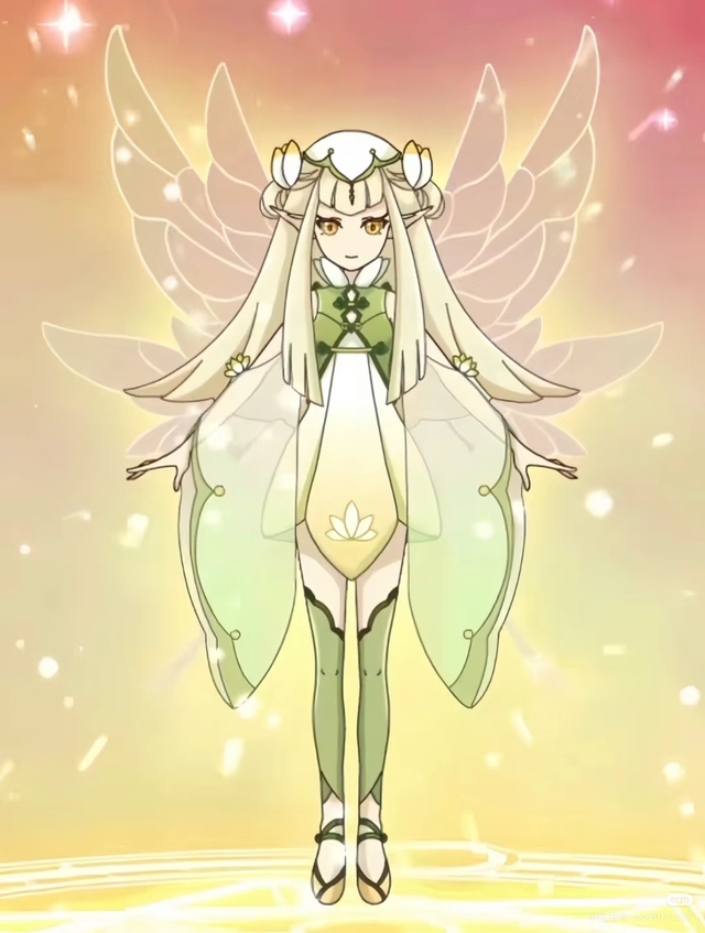 仙子有着淡黄色的头发,黄绿相间的汉服,袖子是淡淡的绿色半透明材质做的,发饰是白色的荷花