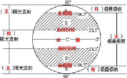寒带:南北纬66.5°至极点,极昼极夜现象