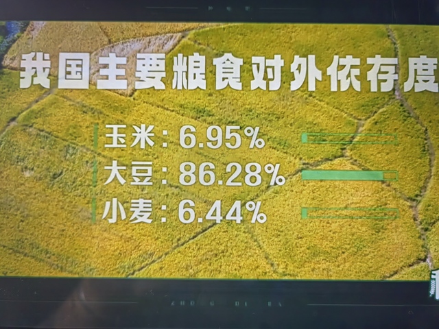 生产出约占世界1/4的粮食这是一个了不起的成就但你可能不知道我国是粮食生产大国,也是消费大国,过去两年玉米、大豆、小麦对外依存度为6.95%、百分之86.28和6.44%