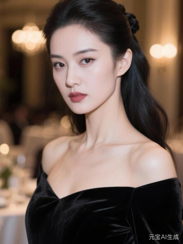 她穿着一身黑色丝绒长裙,裙摆曳地,勾勒出玲珑有致的曼妙身姿。丝绒的材质在灯光下泛着细腻的光泽,低调却又奢华到了极致。领口是精致的一字肩设计,露出白皙修长的脖颈和优美的锁骨,肌肤胜雪,在黑色的映衬下愈发夺目。